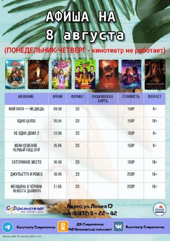 Друзья, делимся с вами афишей кино на выходные Зачем далеко ходить? 🤔 В Доме культуры «Современник» села Началово показывают новинки фильмов, доступные в прокате! #культурныевыходные #Приволжскийрайон