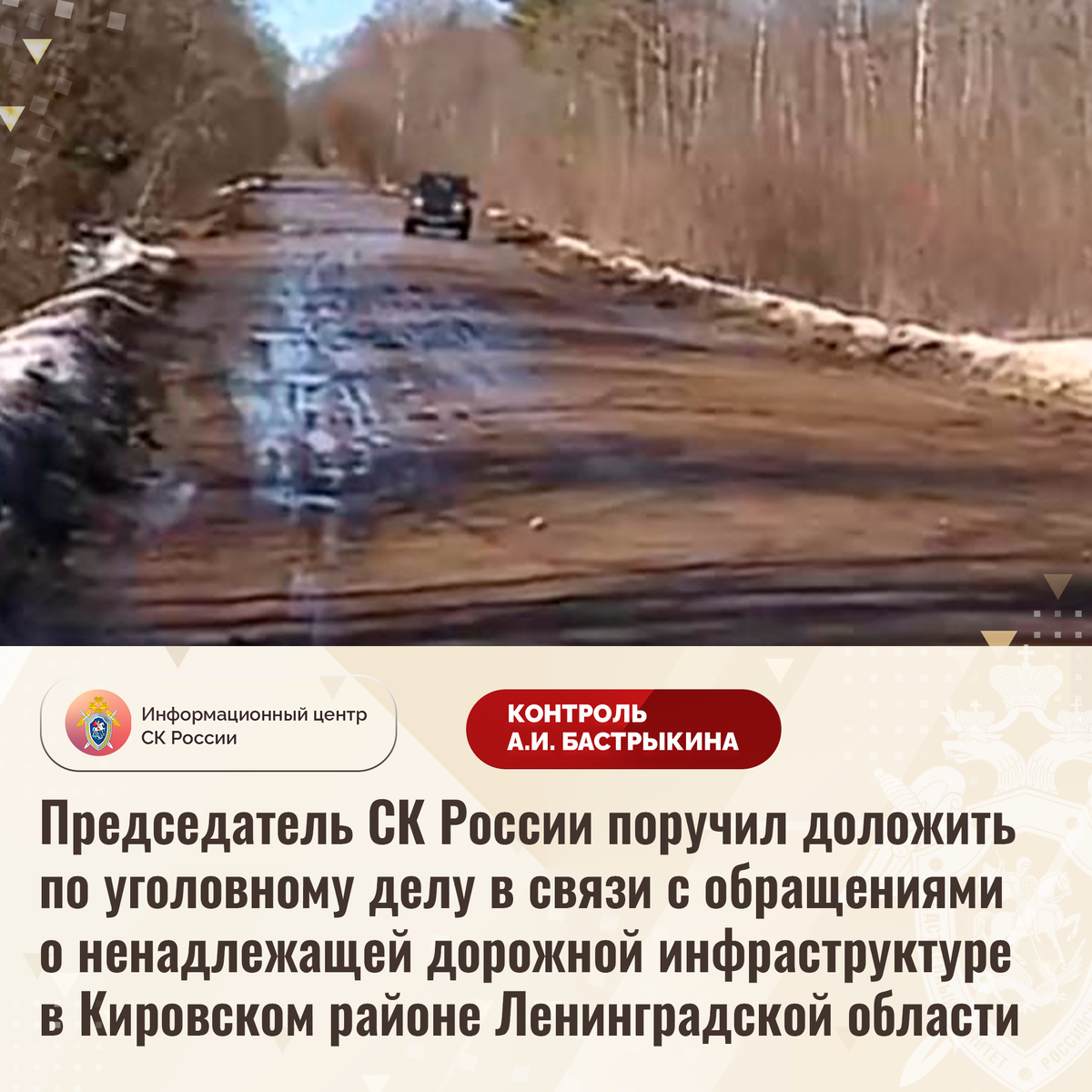 Председатель СК России поручил доложить по уголовному делу в связи с обращениями о ненадлежащей дорожной инфраструктуре в Кировском районе Ленинградской области В Информационный центр СК России поступили обращения по вопросу продолжающегося нарушения прав жителей Кировского района Ленинградской области на качественную дорожную инфраструктуру. В 2019 году единственная подъездная дорога, ведущая к деревне Славянке и нескольким СНТ, была сдана в аренду корпорации «Р-Индустрия». Тяжелая техника организации, перемещаясь по неасфальтированному участку, привела объект в непригодное состояние. Так, на протяжении нескольких лет на поверхности имеются многочисленные ямы, грунтовое полотно при выпадении осадков и таянии снега размывается, а передвижение в сухую погоду приводит к появлению в воздухе большого количества песчаной пыли. В связи с этим проезд транспортных средств к домовладениям и объекту культурного наследия федерального значения «Оборонительные сооружения войск Волховского фронта в