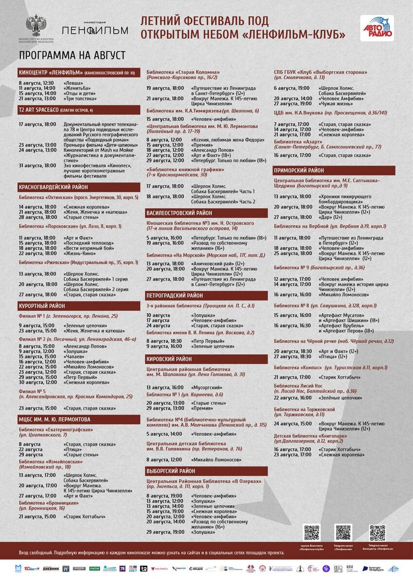 Программа летнего фестиваля под открытым небом «Ленфильм-клуб» на август