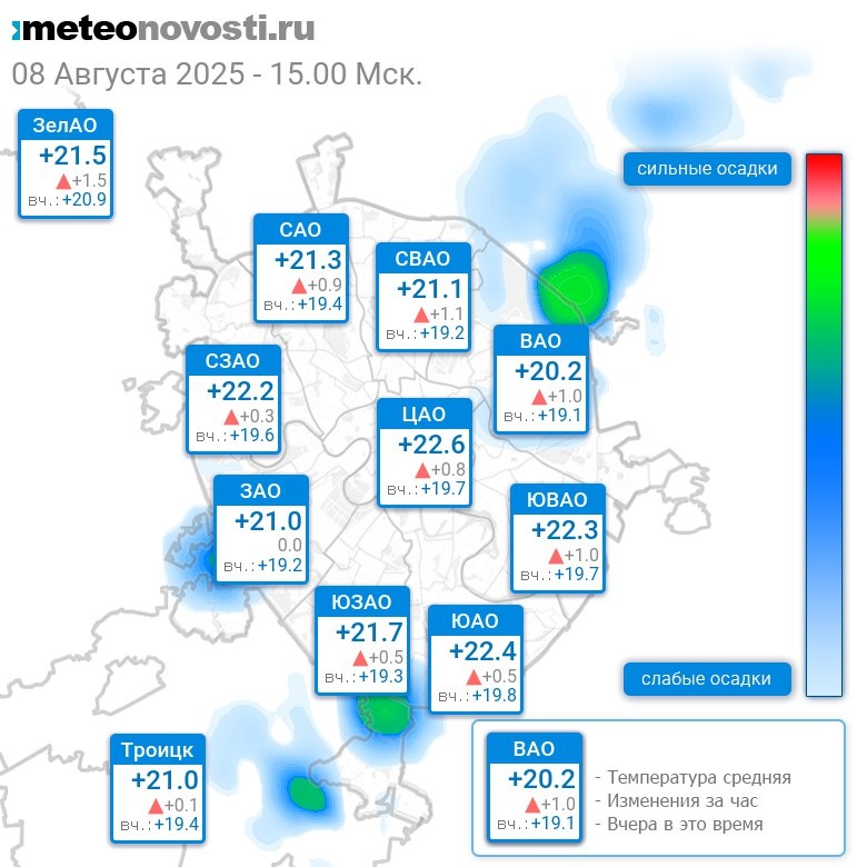 В 15:00 в Москве было от +19.8°C до +23.5°C, средняя температура +21.7°C #погода #Москва #лето #температура #8августа #пятница