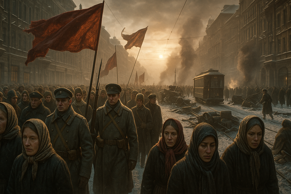 23 февраля (8 марта по новому стилю) женщины вышли за хлеб. Не голод — ещё нет, но оскорбление привычного: «хлеб — с перебоями» в стране хлеба. К рабочим присоединились тысячи. За четыре дня улицы заполнили до 300 тысяч человек. Казаки то били нагайками, то отводили лошадей, не желая ехать в толпу. Солдаты стреляли сначала поверх голов — толпа смеялась; потом — по людям, и она рассыпалась в двери и арки, чтобы снова собраться через квартал. Полиция отступала. В штаб Ставки летели двойные телеграммы: «всё под контролем» и «ситуация тяжёлая, но решаемая». А всякий начальник предпочитает принести наверх не правду, а «правду, в которую готовы поверить».