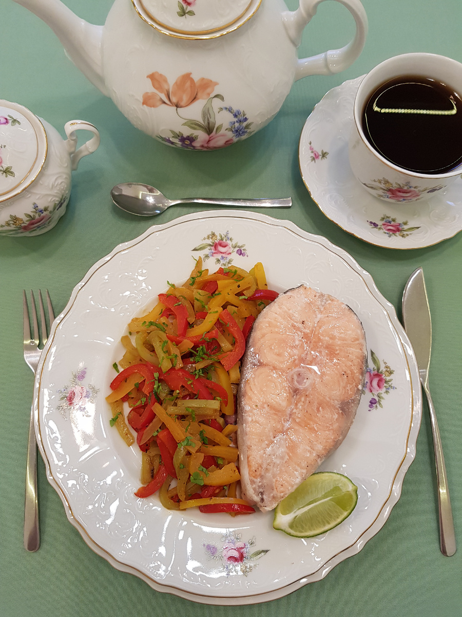 Добрый день, дорогие друзья! Сегодня я представляю вашему вниманию любимое блюдо на праздничном столе моей семьи — запечённая сёмга. Приготовление данного блюда практически не требует усилий и времени, особенно если купить уже почищенную и нарезанную на стейки рыбу, как в моем случае. Для приготовления нам понадобятся: 1,5 килограмма охлажденной сёмги, 1,5 чайной ложки соли, 0,5 чайной ложки чёрного молотого перца. Приготовление: стейки сёмги посолить, поперчить, выложить в жаропрочную форму, добавить 1/4 стакана воды. Запекать в духовом шкафу при температуре 200 градусов Цельсия в течение 25 минут на режиме верхний и нижний нагрев. Готовую рыбу разложить по тарелкам, дополнить кусочками лайма и тушёным перцем. Или выложить на блюдо, украсив маслинами, лаймом, лимоном, помидорами черри и свежей петрушкой. Приятного аппетита!