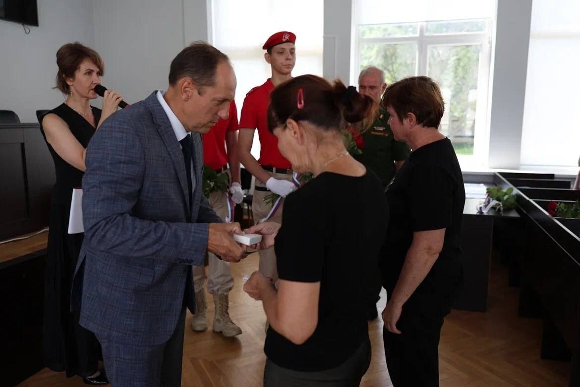Накануне в районной администрации Глава МО "Майкопский район" Марьин М.А. вместе с военным комиссаром Праздниковым С.В. передали госнаграды семьям погибших участников СВО из Майкопского района. Медаль Жукова передали сестрам ефрейтора Валерия Кияшко из поселка Каменномостского Любови Слюсаревой и Ирине Кияшко. Ордена Мужества был удостоен боец из поселка Каменномостского Евгений Усманов. Госнаграду передали его матери Наталье Евгеньевне Симахиной и дяде Владимиру Щепковскому. Спасибо за мужество и честь, отвагу и преданность Родине! Вечная память героям!