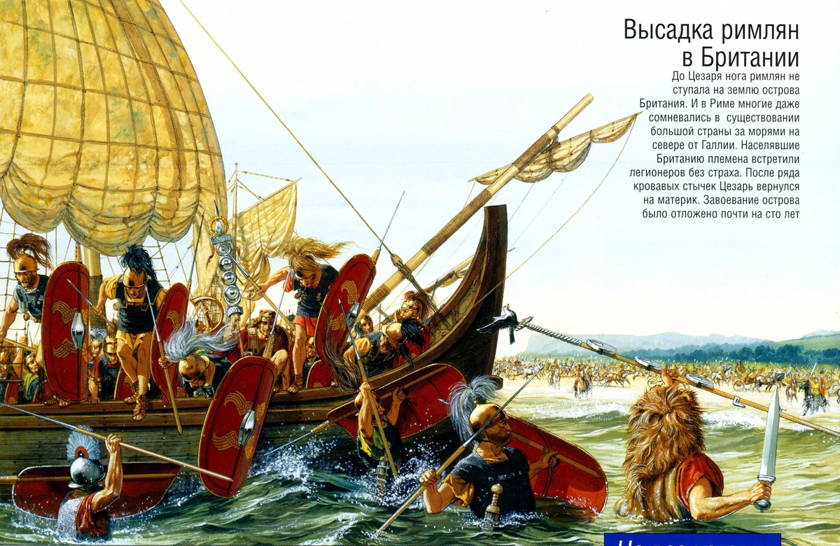 Греки и римляне в древности имели довольно смутное представление о Британии. Подробное знакомство с островом произошло, когда Цезарь в ходе завоевания Галлии (58–50 годы до н.э.) предпринял туда две экспедиции, целью которых была своеобразная разведка боем. Кроме того, он намеревался наказать бриттов, оказывавших поддержку его противникам на континенте. В августе 55 года до н.э. Цезарь собрал 80 кораблей, на которые он посадил два легиона, союзнические отряды и конницу. От купцов, посещавших их страну, бритты узнали о готовящемся вторжении и успели собрать ополчение. Их войско следовало вдоль берега за флотом римлян, препятствуя высадке. Близ Дубры, отогнав огнём метательных машин отряды варваров, Цезарь произвёл высадку и укрепился на берегу. Продвигаясь в глубину острова, он столкнулся с яростным сопротивлением и незнакомой тактикой бриттов, использовавших в сражениях колесницы. Римлянам удалось обратить противника в бегство, но из-за нехватки конницы они не могли развить первона