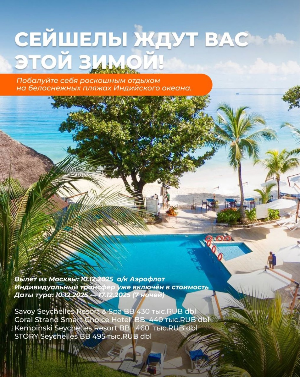 🇬🇧🇬🇧🇬🇧🇬🇧🇬🇧🇬🇧🇬🇧 🌴 Сейшелы ждут вас этой зимой! Побалуйте себя роскошным отдыхом на белоснежных пляжах Индийского океана. ✈ Вылет из Москвы: 10.12. 2025 а/к Аэрофлот 🚖 Индивидуальный трансфер уже включён в стоимость — максимум комфорта с первого шага на острове! Питание - завтраки. 🏝 Отели Сейшел на выбор: • Savoy Seychelles Resort & Spa 430 тыс. руб за 2х взрослых • Coral Strand Smart Choice Hotel 440 тыс. руб за 2х взрослых • Kempinski Seychelles Resort 460 тыс. руб за 2х взрослых • STORY Seychelles 495 тыс. руб за 2х взрослых 📆 Даты тура: 10.12.2025 — 17.12.2025 (7 ночей) 💎 Наличие номеров ограниченно! Забронировать тур и задать вопросы: ☎️ +7 (905) 717-51-97 Вера 💬Написать в WhatsApp 💬Написать в Telegram Отзывы обо мне 🙂