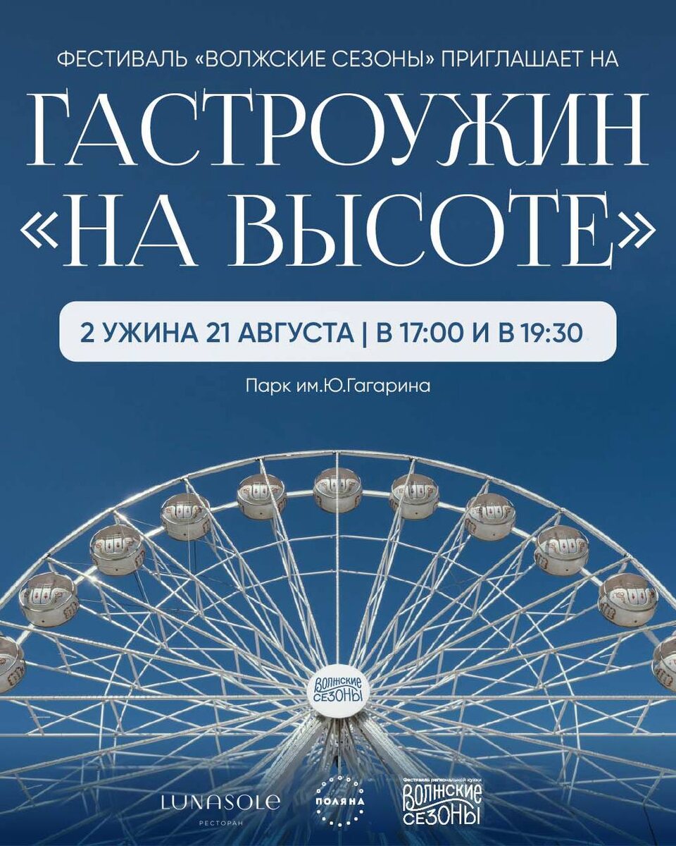 Последний ужин «На высоте» Кажется, после прошлого ужина на колесе обозрения в парке им. Ю. Гагарина город ещё долго гудел от впечатлений — фото, эмоции, восторженные отзывы. И мы просто не могли оставить это событие в прошлом! Поэтому… повторяем! 21 августа снова поднимем вас на высоту, где встречаются волжские вкусы и панорамы города. Четыре курса от бренд-шефов «Ресторанной компании Поляна» Евгения Гурина и Андрея Рогачёва будут подаваться прямо во время движения колеса обозрения: не выходя из уютной кабинки, вы отправитесь в гастрономическое путешествие над вечерней Самарой. В программе: 🩵Жигулёвский хлеб с грибным маслом 🩵Мозаика из волжской рыбы 🩵Утка с полбой, копчёной вишней и смородиновым жу 🩵Жигулёвское мороженое на ржаной бриоши Ужин сопровождается авторским безалкогольным коктейлем «Купеческий» от Егора Ширяева и аудиогидом с интересными фактами о Самаре. 17:00 | «Ранний ужин» | 5000₽ 19:30 | «Ужин на закате» с фотосессией | 7000₽ Кабинка рассчитана на 4 гостей.