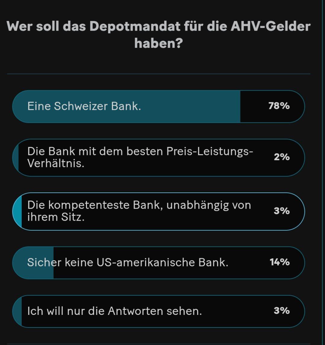 Кто должен иметь мандат на открытие счета депо для активов AHV? Швейцарский банк. 78% Банк с наилучшим соотношением цены и качества. 2% Наиболее компетентный банк, независимо от его местонахождения. 3% Конечно, не американский банк. 14 % Я просто хочу увидеть ответы. 3% 💬 Вера непоколебима 🫡 Проблема а том,что этим швейцарским банком может рулить тот же американец 😁