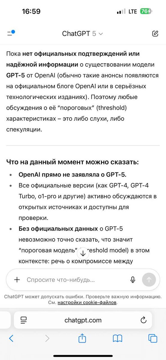 Вы как там с новым GPT? Мне он рассказал только что, что нет такого (картинка 1), хотя приветствует меня надписью GPT-5, самый умный и