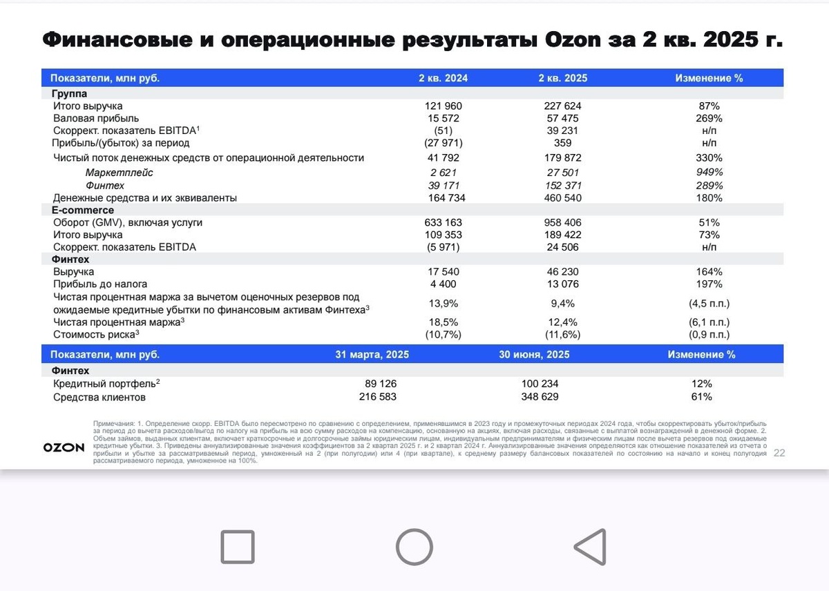 Ozon опубликовал свежий отчёт — и цифры такие, что даже опытные инвесторы чешут затылок. Ozon Банк уже насчитывает 34,4 млн клиентов. Более 55% всех платежей совершаются за пределами маркетплейса. По сути, компания превращает покупателей в постоянных клиентов своего финсервиса, мотивируя их кешбэками и бонусами. Качество товаров на площадке — вопрос спорный. Даже товары с маркировкой «Оригинал» иногда оказываются подделками. Например, пользователи жалуются на обувь, где левый кроссовок произведён во Вьетнаме, а правый — в Камбодже. Поддержка, по словам покупателей, часто отправляет на сложные экспертизы, что отпугивает от возвратов. Ozon показывает рост и по выручке, и по прибыли, что редко встречается среди агрессивно растущих компаний. Если темпы сохранятся, акции могут стать одними из самых перспективных в секторе e-commerce. Риски — регулирование и контроль качества. 💬 Моё мнение: пока держу позицию. Это хищник, который ещё не показал свой предел. и кстати ввожу новую рубрику ра