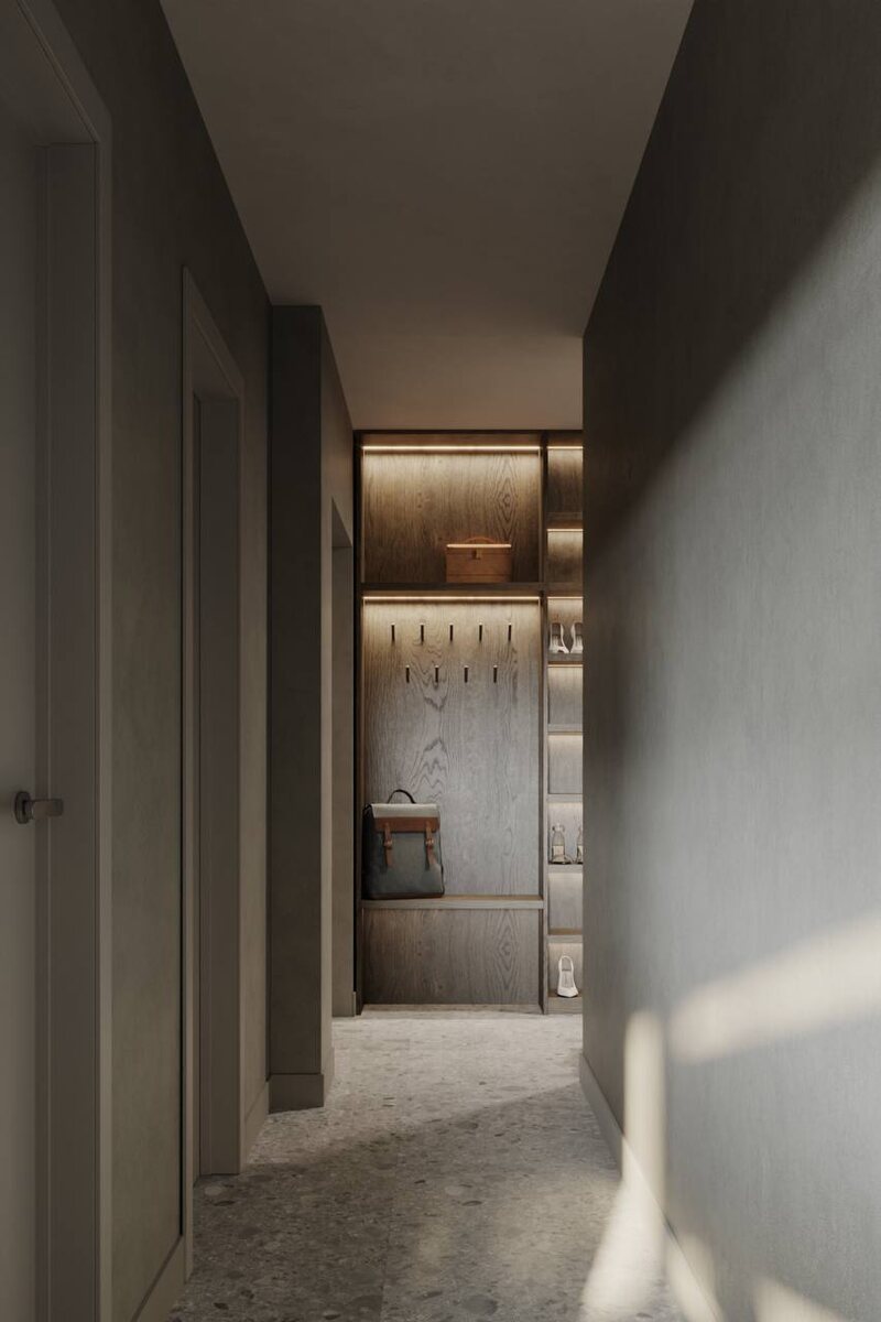 Прихожая. Концепция. Визуализация. Решена проблема с хранением — напротив входной двери вместительный шкаф/хозблок, полка для обуви, открытая вешалка для верхней одежды, в нишу встроили шкаф с стеклянными фасадами для хранения туалетной воды/духов, большое зеркало с подсветкой, акцентная большая банкетка.