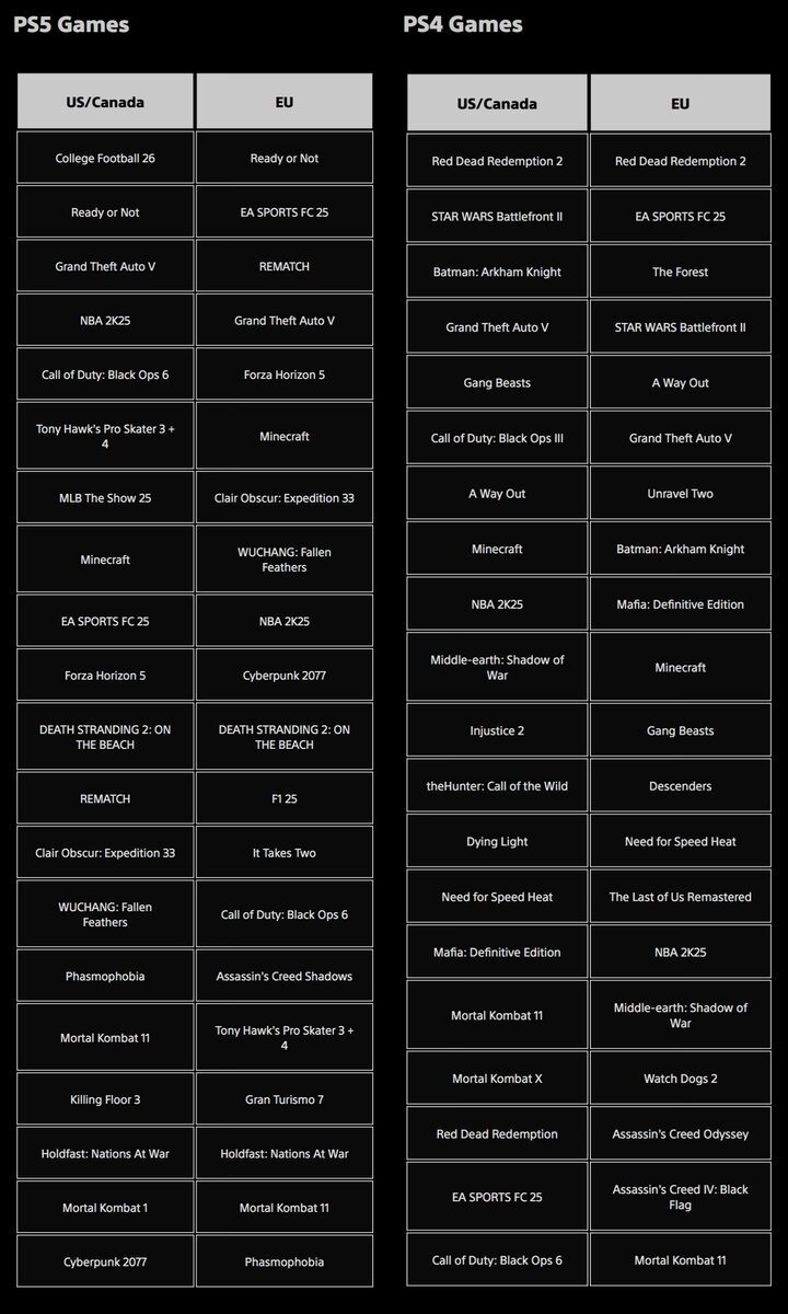 Тактический шутер Ready or Not стал самой скачиваемой игрой июля на PS5 в Европе, по данным PlayStation. В Северной Америке лидирует College Football 26, а GTA V вошла в топ-5 в обоих регионах. На PS4 в обоих регионах первое место заняла Red Dead Redemption 2. PlayStation Новости 🔥 Актуальные скидки | смотреть