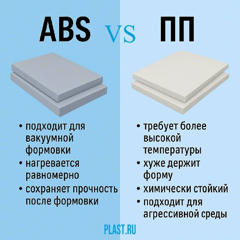 ABS или ПП — что лучше для формовки? Такой вопрос прилетает часто, особенно от тех, кто только начинает работать с листовыми пластиками. Разбираемся. ABS — отлично подходит для вакуумной формовки — нагревается равномерно — после формовки сохраняет прочность — гладкая поверхность (а если ABS-PMMA — ещё и УФ-стойкость) Если изготавливаете кассеты, панели, корпуса, поддоны — это ваш материал. ПП (полипропилен) — тоже формуется, но требует более высокой температуры — хуже держит форму при сложных рельефах — зато химически стойкий и подходит для агрессивной среды Идеален для технических задач, но не лучший выбор для мелкой детализации или тонкой формовки. Вывод простой: Для чёткой геометрии, эстетики и удобства — выбираем ABS. Если задача техническая и важна стойкость — можно рассматривать ПП. Если сомневаетесь — просто напишите нам. Поможем подобрать под конкретную задачу и сразу отрежем, что нужно. Смотреть каталог plast.ru Телефон: +7 (800) 555-52-54 ; +7 (495) 479-00-00 Чат канала: