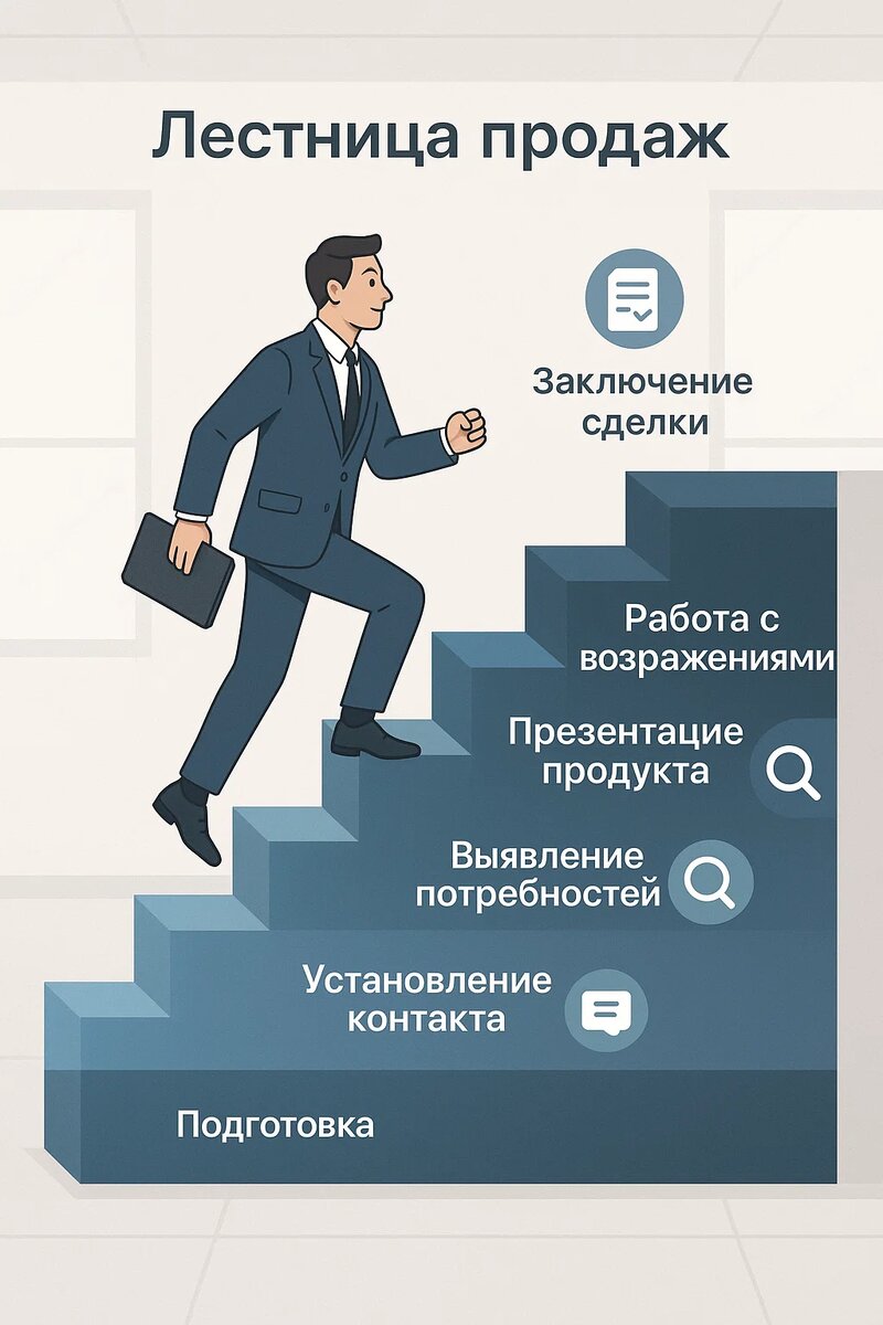 Позже на её основе развились такие инструменты, как воронка и лестница продаж. Со временем лестница стала неотъемлемой частью любого обучения продажам. 📌 если вы не знаете лестницу продаж — вы не управляете сделкой. А значит, не можете считаться профессиональным менеджером. Этапы классической лестницы продаж: 1. Подготовка