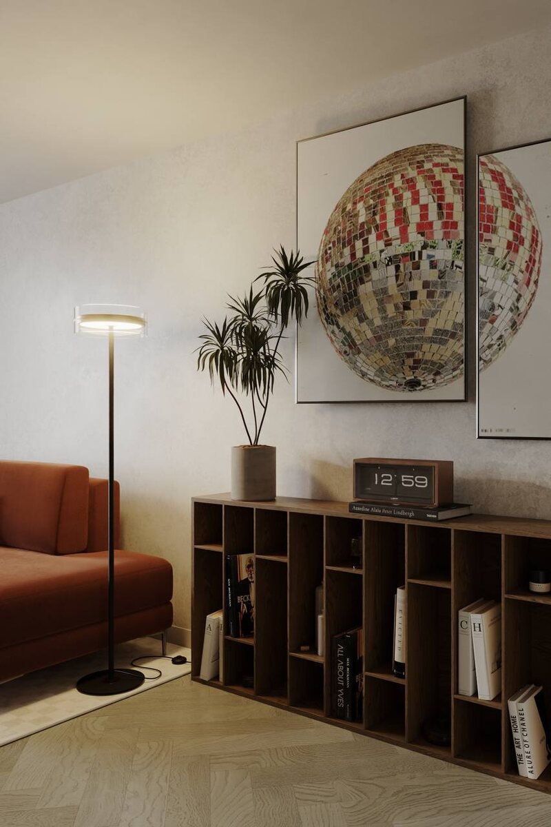 Гостевая. Концепция. Визуализация. Гостевая и в будущем детская комната. На входе вместительный шкаф для хранения и открытый аутентичный стеллаж. Акцентный декор над стеллажом, который поддерживает диван с раскладным механизмом. Кофейный/винный столик диаметром 60 см. Напротив дивана длинная тумба под ТВ из той же текстуры, что шкаф и стеллаж. Потолочный минималистичный светильник над мягкой зоной, две точки света у шкафа и торшер.