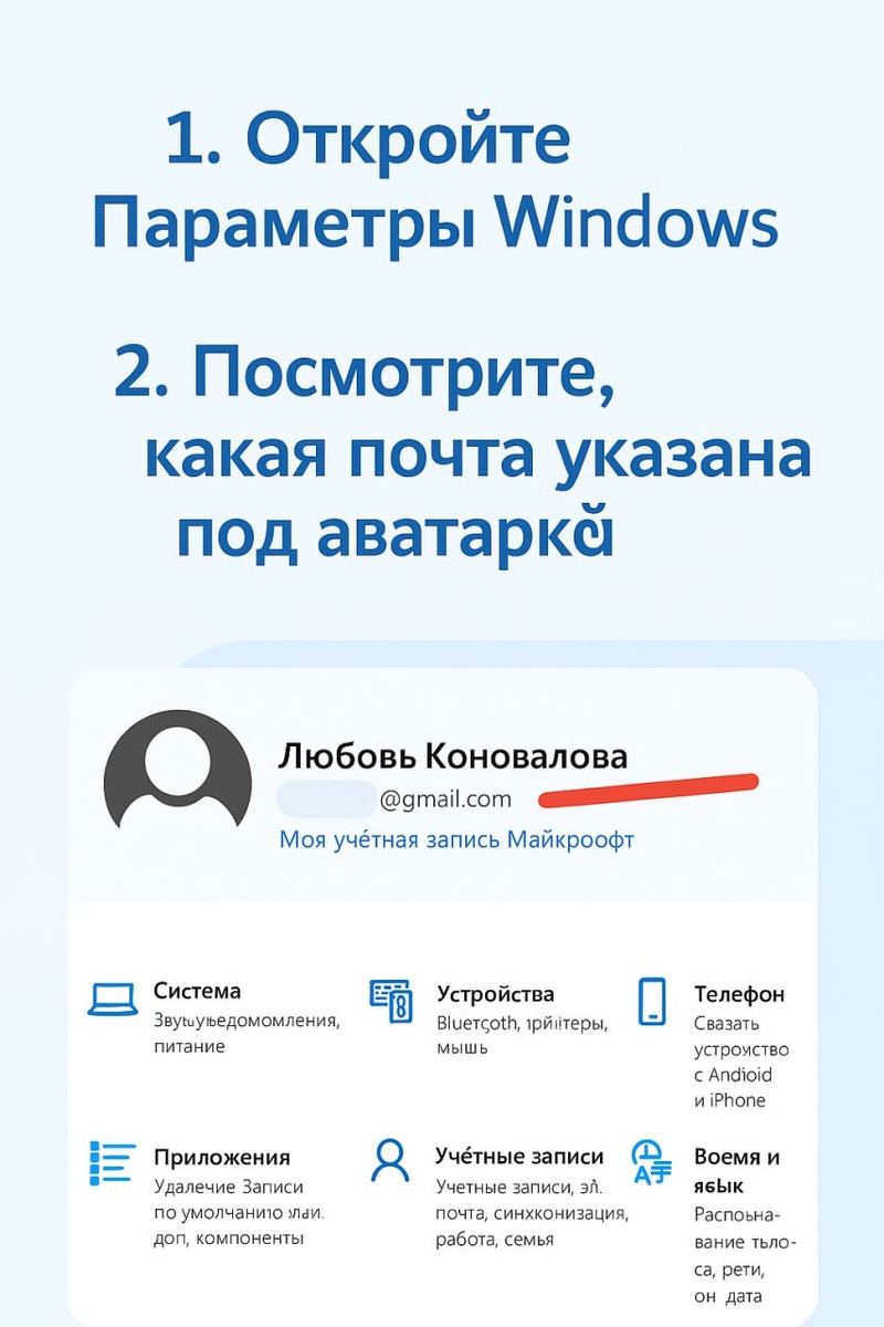 ⭐️ Проверка кто владелец вашей Windows 10-11 • Услуги MSKC Может так получиться, что Windows не совсем ваша 😄 — и это стоит проверить. Иногда Windows устанавливает другой человек и привязывает к ней учётную запись Microsoft, от которой у вас нет пароля. В этом случае при любом сбое вы можете потерять доступ к компьютеру и своим данным. ⭐ Как понять, всё ли в порядке: 1. Откройте Параметры Windows 2. Посмотрите какая почта указана под аватаркой (пример — на картинке к посту) ✅ Если это Ваша активная почта или написано "Локальная учётная запись" — всё хорошо и вам ничего не нужно делать! ⚠️ Если указана чужая почта — это повод обратиться к нам 🛠 Что делает Мастер: — Проверим, кто указан владельцем — Исправим, если указана чужая учётка — Перенастроим систему, чтобы доступ был только у вас — Дадим рекомендации по защите 📌 Как заказать — Напишите в чат @mskcpro, например: Нужна проверка владельца Windows — Или нажмите в боте @mskcpro_bot → Заказать Настройку и укажите: «Проверка