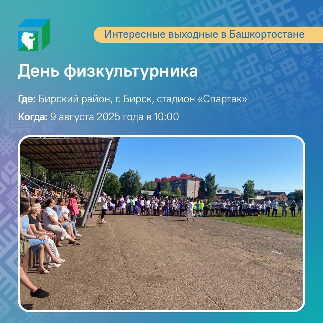 Эти выходные в Башкортостане обещают быть спортивными – по всей республике проходят мероприятия ко Дню физкультурника. Например, в Бирске 9 августа пройдут спортивные соревнования, мастер-классы по фитнесу, занятия йогой и танцевальный джем. Вы сможете поучаствовать в состязаниях по футболу, шахматах и даже стрельбе из лука. А в Нефтекамске жителей и гостей приглашают 9 августа на гандикап по улицам города, чемпионат по футболу и пляжный волейбол. Подробную программу мероприятий смотрите на странице администрации. Узнать, какие мероприятия ко Дню физкультурника запланированы в вашем муниципалитете можно в соцсетях вашей администрации. В г. Агидели 9 августа пройдет ретро-фестиваль «Агидель. Назад в будущее». Вас ждут спортивные турниры, башкирское лото, фотозоны и ретро-дискотека. Вечером вы сможете послушать выступление ВИА «Алые маки» и посмотреть фильм «Операция «Ы» и другие приключения Шурика» на открытом воздухе. В г. Октябрьском – чемпионат города по боксу в дисциплине «Удар
