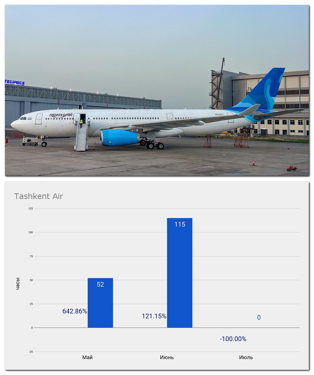 Итоги июля: Tashkent Air По неизвестным причинам единственный борт авиакомпании Tashkent Air - Airbus A330-200 с регистрационным номером UK33077, не летает с 21 июня. Среднесуточный налёт в июле уменьшился ⬇️ на 100% и составил 0 часов. Количество часов налёта самолёта авиакомпании Tashkent Air за июль уменьшилось 🔽 на 100% по сравнению с июнем и составило 0 часов. Общая динамика за последние 3 месяца представлена на графике. #статистика #tashkentair #июль2025