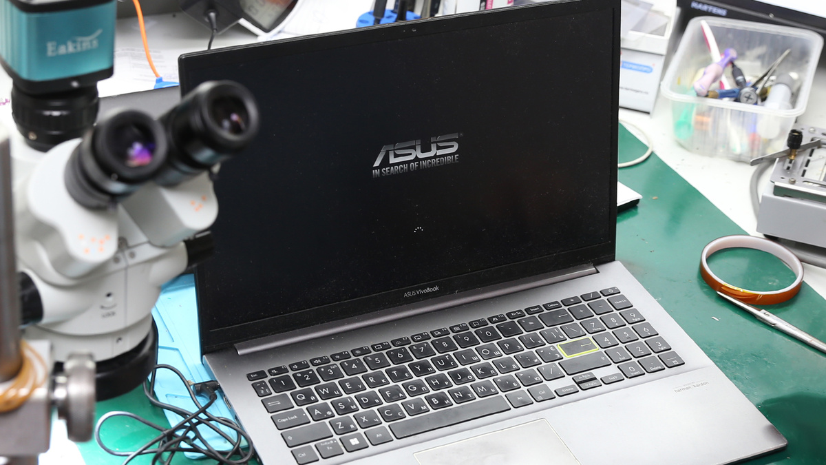 Смартфоны или ноутбуки – что же всё-таки лучше? Для разных задач, нужны разные «инструменты». Например, чтобы посмотреть ленту новостей с утра или в дороге, лучше подойдёт телефон. А если же требуется сделать какую-то работу, например, написать текст или смонтировать видео, то для этого нужен ноутбук. Однако кроме разделения по «специальностям», имеется ещё разделение по «функциональности». В этом плане ноутбуки уступают смартфонам, потому что, телефон можно положить в карман, сделать фото, использовать гаджет в общественном транспорте. Но, у каждого свои предпочтения… В этот раз к нам обратился владелец ноутбука ASUS VivoBook S15 S533EA-BN240. У гаджета наблюдался целый ряд неисправностей: устройство работает только от сети, тачпад порой не работает, пропадает контакт USB. Первым делом включаем лэптоп и отключаем провод питания. Ноутбук сразу выключается, так как ёмкости в батарее нет. Такое обычно случается, когда аккумулятору уже много лет. Снова включаем ноутбук и теперь проверяем