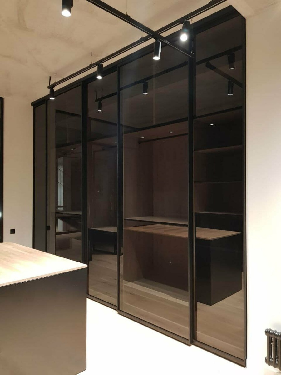 Раздвижная перегородка для зонирования комнаты может быть каркасной с профилем по контуру или цельностеклянной без видимых рам. Каркасные системы позволяют использовать стекло от 6 мм, требуют толщины 10 мм для самонесущей конструкции.
