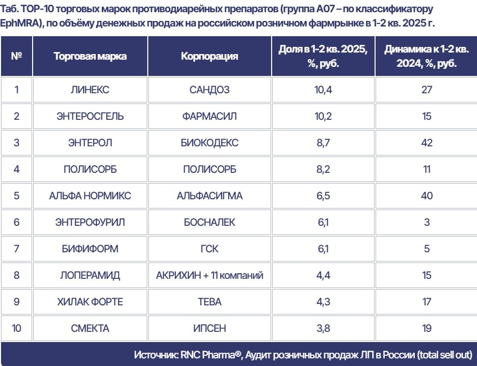 Антидиарейные препараты показали рост в денежном выражении по итогам 1-2 кв. 2025 года. Данная категория была реализована на сумму свыше ₽22.6 млрд, что на 16.7% больше аналогичного периода прошлого года. Потребление в натуральном выражении снизилось на 1.5%, укрепляя многолетний тренд. Более 66% всех продаж обеспечили препараты регулирующие равновесие кишечной микрофлоры и кишечные адсорбенты.