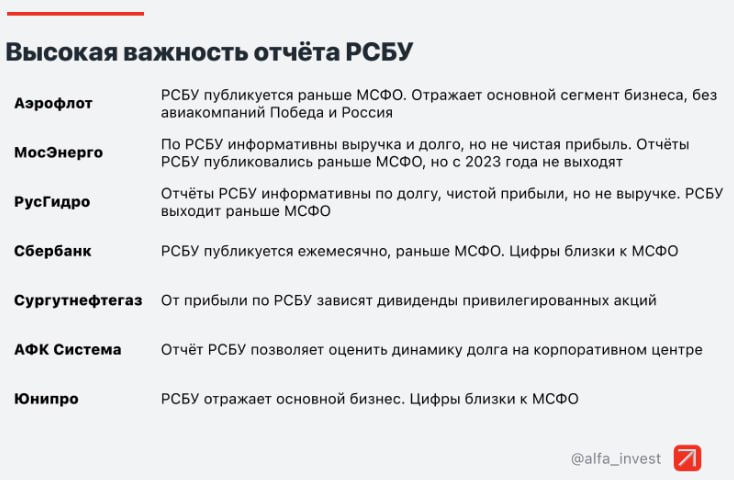 Попалась любопытная статья от брокера Альфа-Инвестиции: Отчёт по РСБУ. Для каких компаний это важно. Почитал — мне было интересно. Поделюсь с вами, это улучшает понимание про отчетность РСБУ и её значение. В чем различия между отчетностью РСБУ и МСФО МСФО: более информативны для инвесторов, так как отражают максимально полную, прозрачную и сопоставимую информацию о деятельности компании, включая все её дочерние общества. Активы и обязательства в МСФО оцениваются по справедливой стоимости. РСБУ: ориентированы на соблюдение российских законодательных и налоговых требований, отчётность неконсолидированная, отражает деятельность только головной компании. Активы учитываются по исторической стоимости. 😁Таким образом в большинстве случаев отчет РСБУ малозначительный, но есть исключения, которые тоже подсветили в Альфа Инвестициях. Вот это интересные наблюдения: Компании, для кого важна отчетность РСБУ: Аэрофлот, МосЭнерго, РусГидро, Сбербанк, Сургутнефтегаз, АФК Система, Юнипро. Почему? ▪️Ди