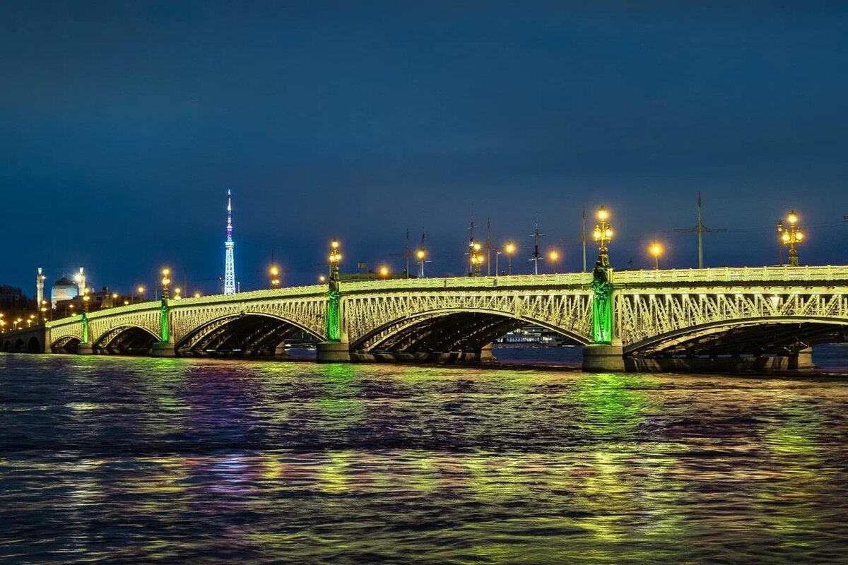 ✨ Три моста Петербурга засияют в цветах Ленты Ленинградской Победы В честь 81-й годовщины завершения Ленинградской битвы Дворцовый, Троицкий и мост Бетанкура украсят специальной подсветкой. 9 августа пролёты переправ осветят оливковым цветом — символом Победы, а опоры засияют зелёным, олицетворяющим жизнь и возрождение. Иллюминация начнёт работу в 21:40 и продлится до 4:25 утра, а на стрелке Васильевского острова зажгутся факелы Ростральных колонн. Фото: Комитет по энергетике и инженерному обеспечению Петербургский дневник