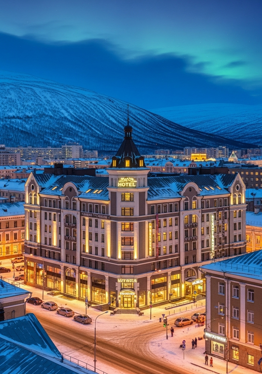 Современный девятиэтажный отель в самом сердце Мурманска напротив железнодорожного вокзала. Здание обращено главным фасадом к центральной площади «Пять углов», что делает его максимально удобным для гостей города.