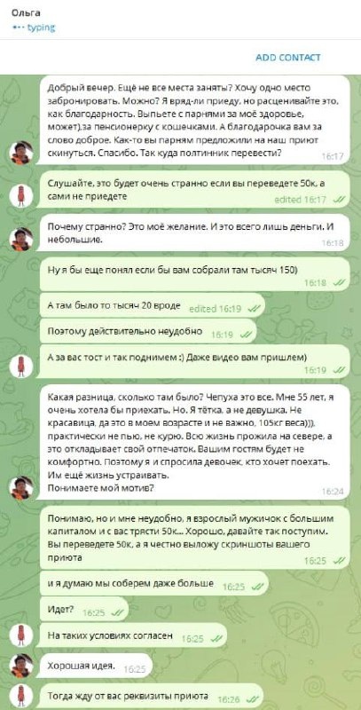 Тут несколько нестандартная ситуация... Короче говоря есть подписчица канала Ольга и она волонтер в приюте для питомцев. Так получилось, что однажды мы собрали на приют тысяч 20-25, просто в комментах, просто потому что можем. Для собачек и кошечек. И Ольга решила перевести 50к в качестве "алаверды" на тусу, но сама ехать не хочет. Видит Бог я пытался ее отговорить, но она непреклонна, а значит давайте сбросим ей денег больше на приют, где она волонтерит (это не ее счет и она с этого имеет ровно 0). Она даже сказать не сможет сколько денег пришло, поэтому просьба, если задонатили - скрин в комменты, я сам пульну двадцатку для начала. Как по мне - это одна из немногих вещей на которые денег не жалко: 1) Животные, за которых мы должны нести ответственность 2) Дети - сироты 3) Наши старики (однако не все, среди них водятся и крайне неприятные персонажи, которые сами виноваты в своем положении) И особенный пункт: 4) Сильно больные дети - сироты (именно сироты, а родителям, что собирают дон