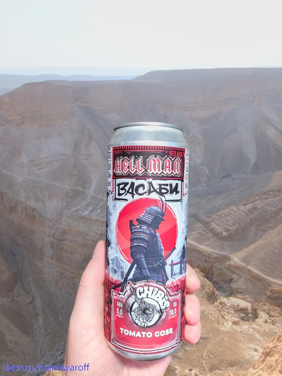Думаю, вы без проблем догадались, что сегодня у нас московская пивоварня Chibis Brewery со своей очередной томаткой. На сей раз это самурайская версия под названием Hell Man: Васаби. На нынешний момент это последнее пиво из данной линейки - появилось в апреле сего года. У меня банка из первой партии, а вскрыл я ее незадолго до того, как ей стукнуло четыре месяца. Срок годности составляет год при хранении в холодильнике. Описание делал Капитан Очевидность: Томатное Gose с добавлением васаби. В составе присутствует томатный сок с пастой, неназванные специи и сорбат калия. ТТХ: Пиво напоминает жидковатый томатный сок. Пены нет. Слегка пахнет копченостью и васаби. Во вкусе сладкие помидорки и небольшой привкус васаби. В послевкусии к ним присоединяется умеренное жжение от васаби. Посолить можно было бы чуток побольше. Пьется с удовольствием. Вкусная штука получилась. Xpeнa в самый раз добавили - больше был бы перебор. Восемь с половиной баллов. В "Леще" брал по 290 рублей за 0.45 л. В ста