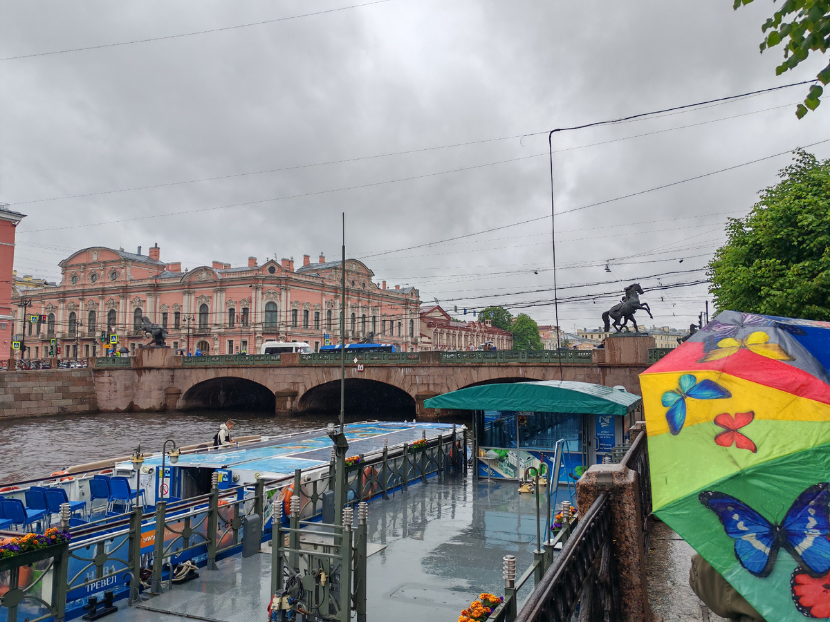 Поэтому мы прогулялись просто под дождичком вдоль Фонтанки и цирка, заглянули к Чижику-Пыжику, по Марсовому полю прошлись и дальше отправились к Дворцовой пристани. В прошлом году так же гуляли.