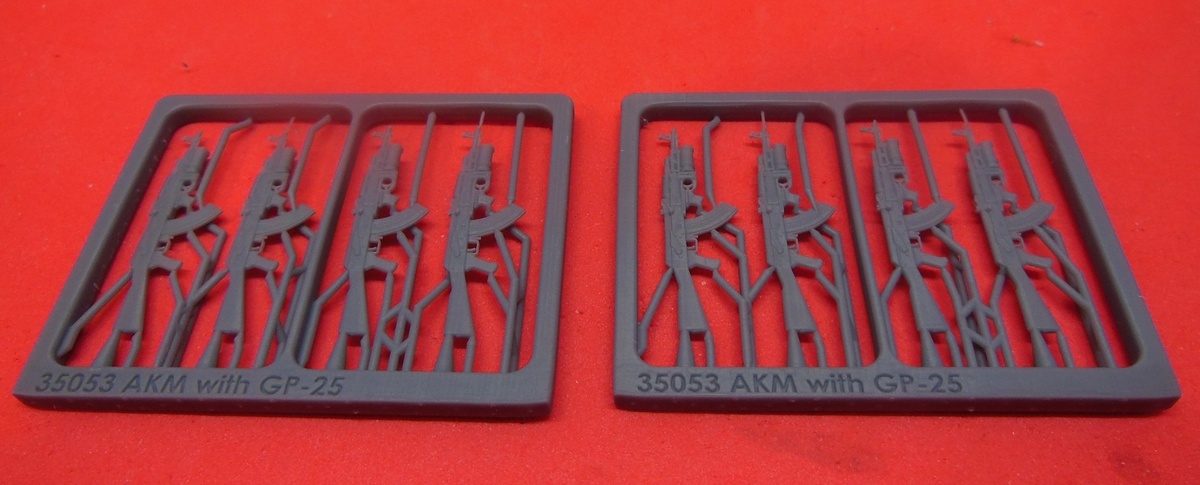 OKB Grigorov из Болгарии выпустила на 3D-принтере набор моделей автоматов АКМ с подствольными гранатометами ГП-25 (8 шт. в наборе) в масштабе 1/35: AKM assault rifle with ГП-25 grenade launcher (каталожный номер W35053)