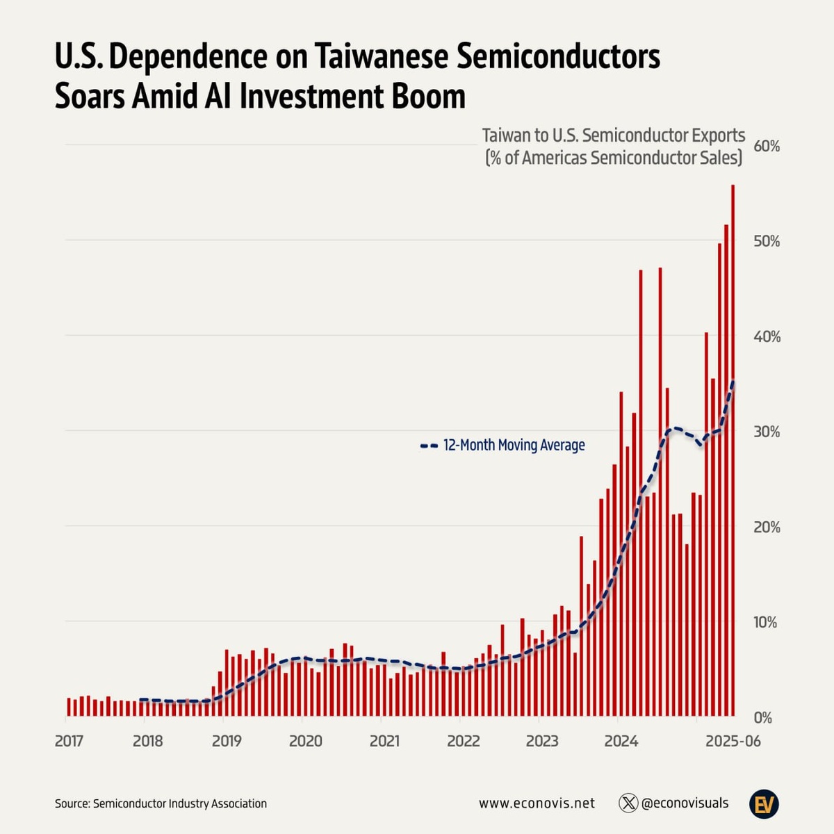 Зависимость США от тайваньских чипов бьёт рекорды на фоне бума инвестиций в ИИ Поставки полупроводников из Тайваня в США — от интегральных схем до процессоров для обработки данных — за последние годы выросли в разы благодаря взрывному росту спроса, связанному с искусственным интеллектом. Если в 2018 году их доля в общем объёме продаж полупроводников в Америке составляла лишь 2%, то в 2019–2021 годах она стабилизировалась около 6%. К середине 2025 года этот показатель взлетел до 35% в среднем за последние 12 месяцев, а в июне достиг исторического максимума — 56% за один месяц. Такой скачок подчёркивает, насколько критической стала роль тайваньских производителей в американской технологической цепочке, особенно на фоне усиливающейся глобальной гонки за лидерство в сфере ИИ.