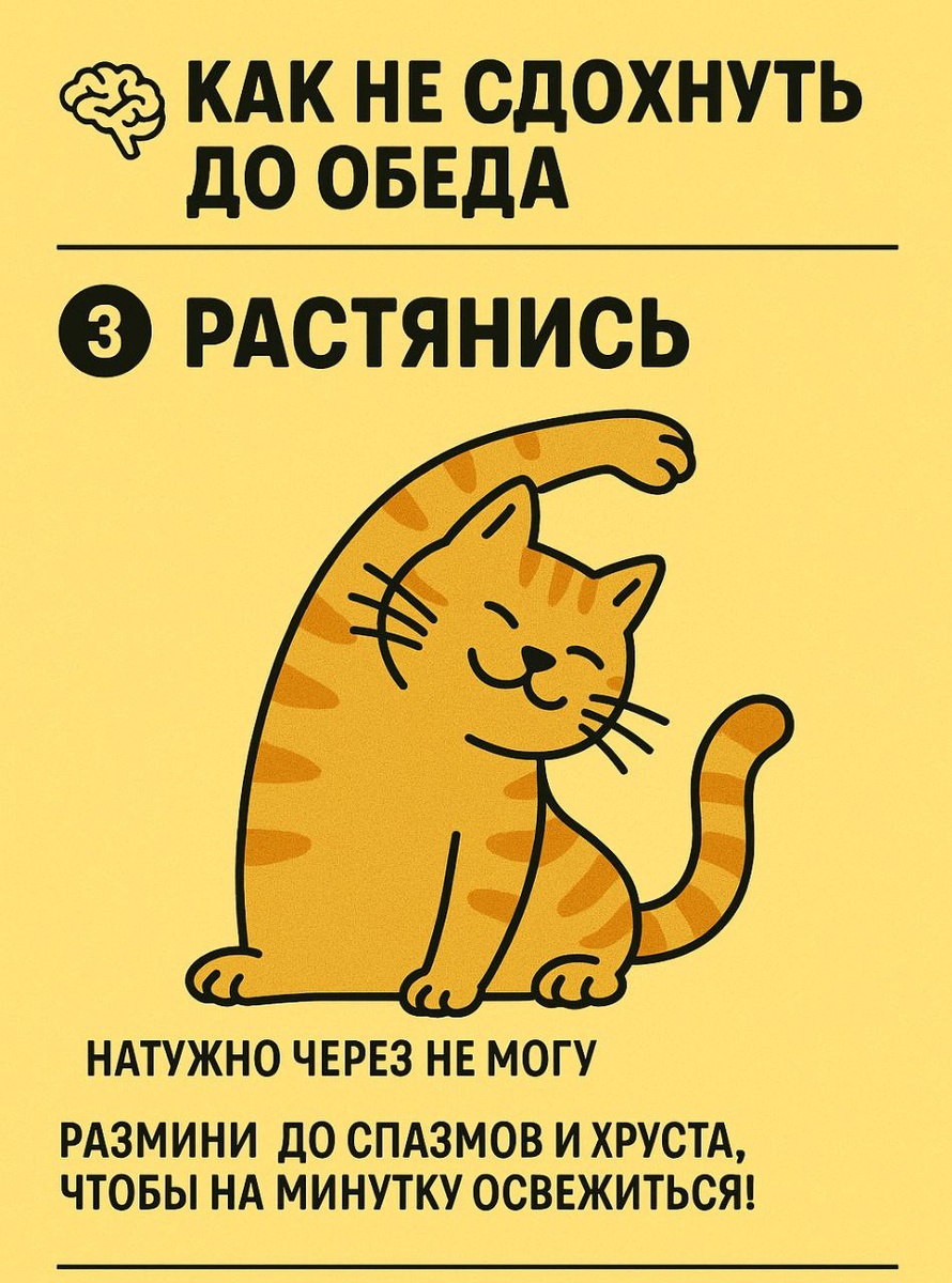 Утренняя растяжка и даже простые потягушки без усилий и нагрузки могут сделать твою жизнь качественно лучше. Заведи себе привычку растягиваться или потягиваться каждый день, и жизнь начнет меняться в лучшую сторону! Увеличение кровотока или как замедленное «мясо» снова оживает После ночи в объятьях любимой, рука затекла и отказалась подчиняться? Ноги ноют, будто всю ночь бежал марафон, а не ворочался в кровати, уворачиваясь от шальных разбросов рук и ног супруги? Тебе точно поможет растяжка! Представь: ты тянешь свои конечности, и кровь, как старая добрая подруга, охотно возвращается к тебе с кислородом и букетом молочной кислоты, чтобы разбудить тело. Итог? Ты снова живой и готовый к свершениям… или хотя бы к кофе! Утренняя «разбудка» нервной системы Когда тело уже проснулось, а разум словно призрак витает между грезами и реальностью, растяжка сможет пробудить нервную систему по-настоящему. Это как утренний будильник для твоей нервной системы! Она активирует твои нервы, и вот ты уже н