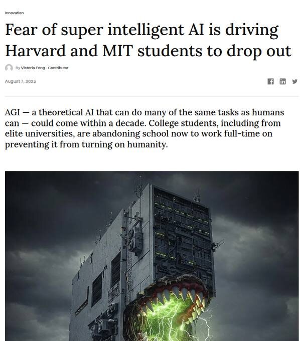 Студенты Гарварда и MIT бросают учёбу из-за страха перед ИИ Выпускники топ-университетов уходят в стартапы и компании по безопасности искусственного интеллекта. Причина — опасения, что уже к концу десятилетия ИИ автоматизирует до 20% профессий. 💬 Один из недавних выпускников Гарварда сказал: "Если твоя профессия исчезнет через 5–7 лет, каждый год в колледже — минус год карьеры." 👉 Больше новостей и аналитики об ИИ — в моём Telegram-канале: https://dzen.ru/id/670c7fe545d6d72caa724e37