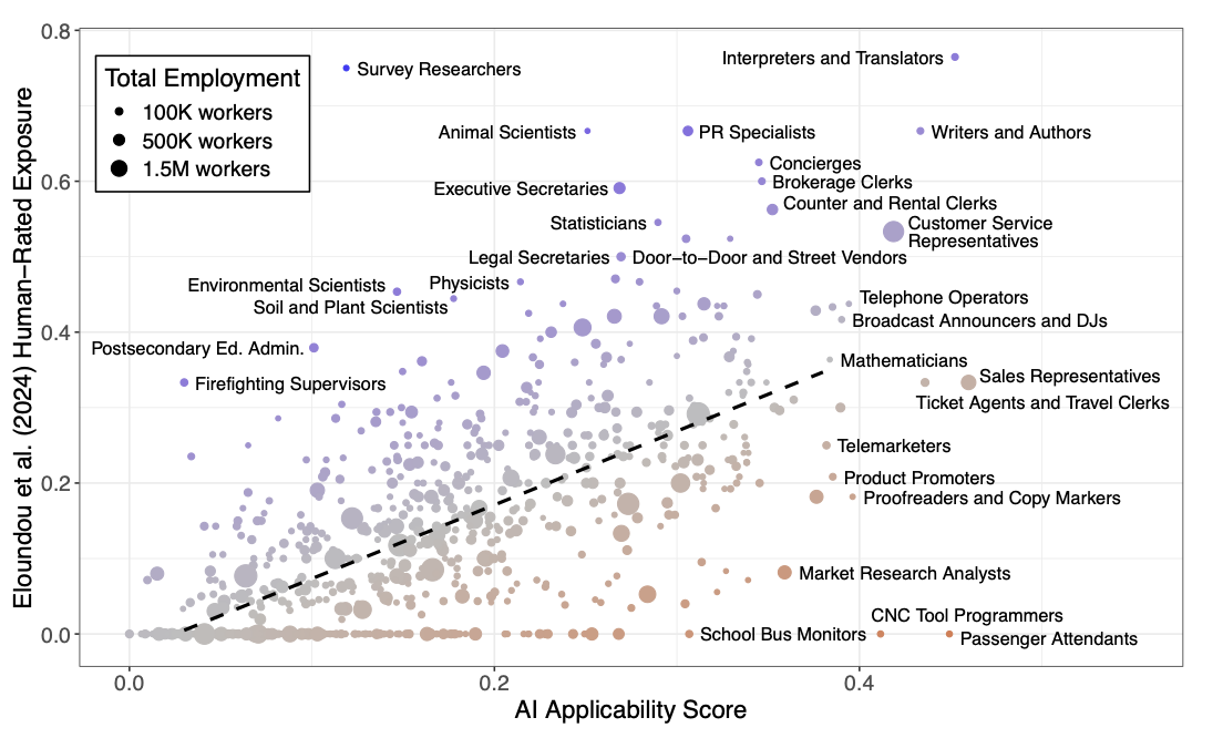 Сравнение с метрикой E1 из Eloundou et al. (2024), где люди оценивали, в каких задачах LLM позволит экономить ≥ 50 % времени, показывает корреляцию r = 0.73 на уровне профессий и r = 0.91 на уровне групп SOC. Это говорит о том, что реальные данные использования подтверждают большинство экспертных прогнозов.
