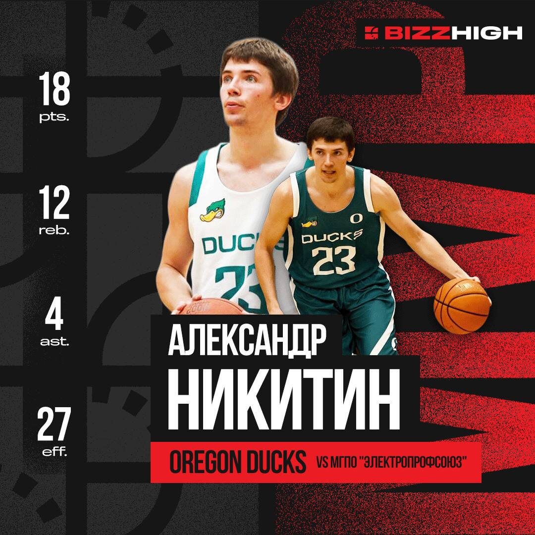 MVP ABL Bizz Никитин Александр (Oregon Ducks) vs МГПО "Электропрофсоюз" Bizz High 53:50 18 очков, 12 подборов, 4 передачи, 27 эффективность Первая половина матча Oregon Ducks — МГПО "Электропрофсоюз" во многом свелась к индивидуальному противостоянию Александра Никитина и Михаила Комлева. Комлев отвечал больше за скоринг, тогда как Никитин ещё и много подбирал и и старался задействовать партнеров по команде. Во второй половине встречи Орегона перестроил свою игру, тогда как "Энергетики" продолжили играть через через одного баскетболиста. Несмотря на потрясающую статистику Комлева, его команда уступила. Никитин в свою очередь стал брать меньше бросков на себя, но продолжил эффективно играть. Концовку Орегон закрыл уже без своего лидера, получившего 5 фол, но все равно Александр сделал очень много для важной победы команды в борьбе за плей-офф. 1️⃣@ABL Moscow