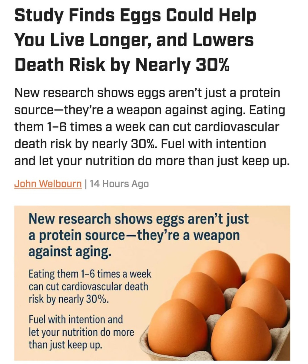 Яйца ПРОДЛЯТ ВАМ ЖИЗНЬ — ученые. Исследование показало, что их употребление снижает риск ранней смерти на 30%. Если съедать каждую неделю хотя бы по 6 яиц — вы проживете ДОЛЬШЕ на треть. Все из-за огромного количества качественного белка для мозга, сердца и мышц, ударной дозы витаминов B12, A, D и К2. Если есть достаточно яиц — у вас будет сумасшедший энергообмен в организме, перестанет скакать холестерин, а риск заработать болезни сердца и сосудов снизится почти на 20%. Меню на завтрак найдено.