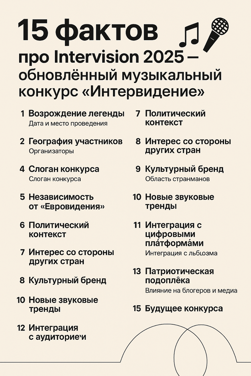 В 2025 году возвращается легендарный конкурс Intervision — «Интервидение». Уже 20 сентября он пройдёт рядом с Москвой и соберёт более 20 стран-участниц из БРИКС, СНГ, Латинской Америки и Ближнего Востока. Это событие обещает стать главным культурным и музыкальным явлением года, объединяющим традиции и современные тренды.