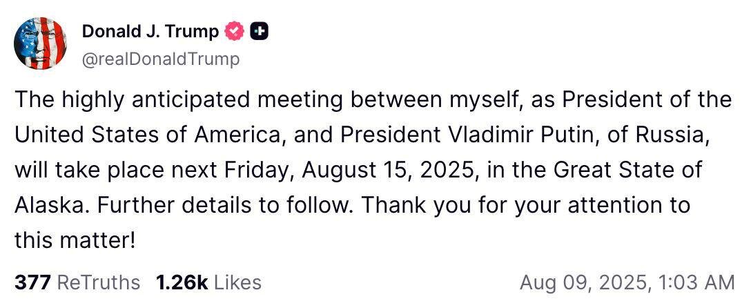 Встреча Путина и Трампа пройдет 15 августа на Аляске, заявил президент США. Детали обещал сообщить позже.