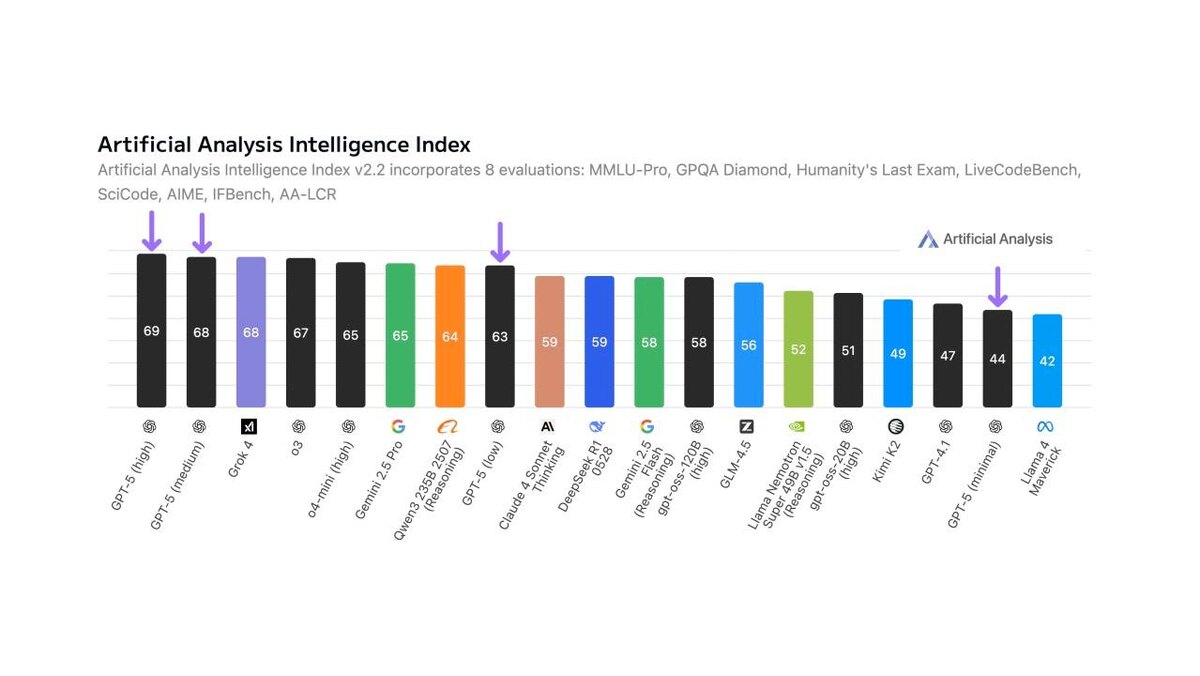 GPT-5 стабильно показывает высокие результаты в независимых тестах интеллекта.
