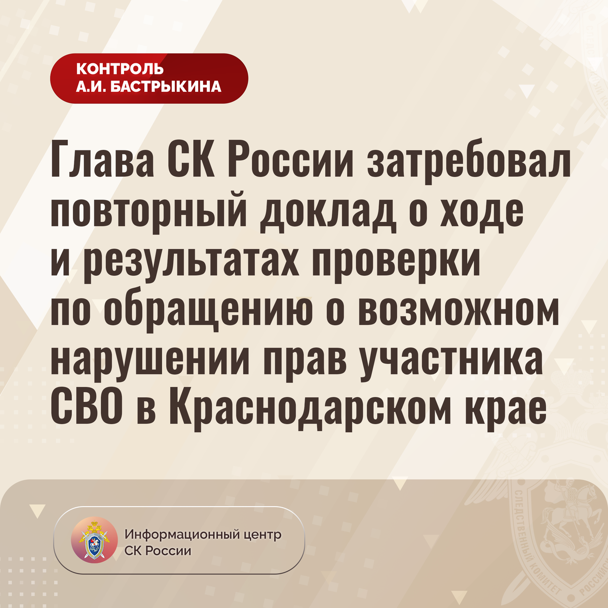 Глава СК России затребовал повторный доклад о ходе и результатах проверки по обращению о возможном нарушении прав участника СВО в Краснодарском крае