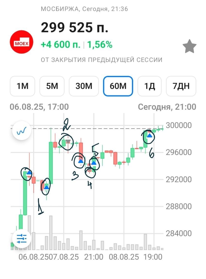 #мыслиIMOEX Кажется, геополитическое решение уже вот-вот будет готово. Со вчерашнего дня занимаюсь исключительно спекуляциями по фьючерсу на индекс. Вкратце на графике было следующее: (1) гео-позитив, лонг (2) немного подфиксировался после импульса вверх (3) добрал на флаге (4) очканул и сдал то, что добрал (5) передумал и купил снова (6) еще один импульс вверх, добрал, кажется идем на 3000.
