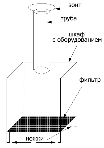 Конструкция шкафа представлена на схеме. У шкафа есть ножки – опоры приподнимающие нижнюю грань шкафа над поверхностью пола на 350 мм, при этом вся нижняя грань шкафа это решётка с фильтрующим элементом. Сверху установлена труба диаметром 250 мм длиной от 3 до 6 м.