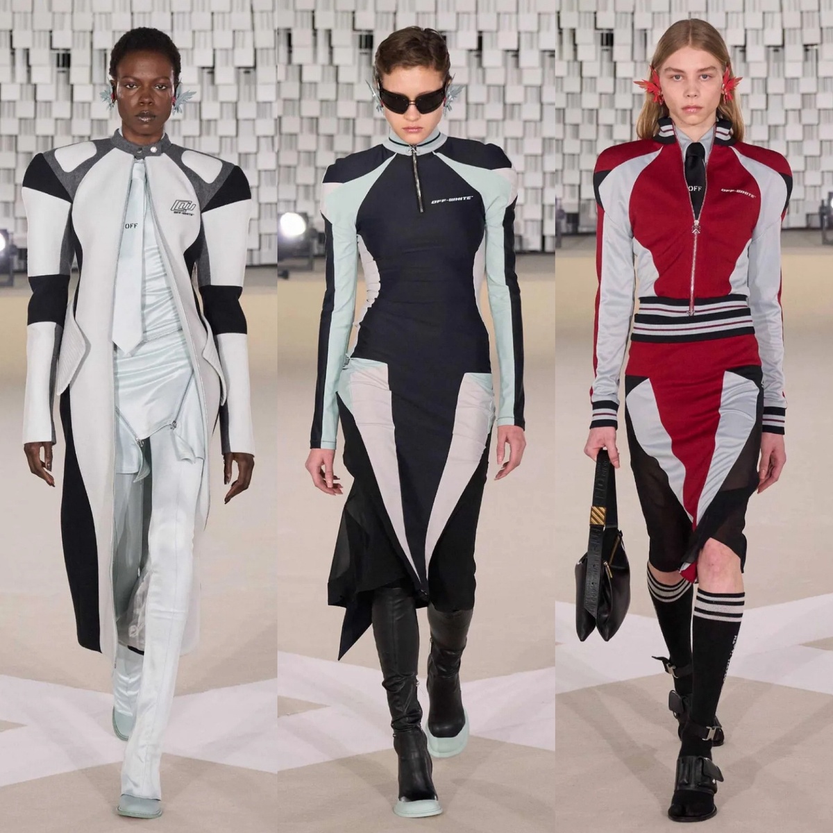 Иб Камара представил новую коллекцию под названием «State of Resistance», в которой ярко отразил основополагающие принципы бренда — силу сплочённости и всеохватывающее видение моды. Осенний показ Off-White — это глубокое размышление о том, как сохранить свою индивидуальность в нашем мире. «Я представляю себе Off-White как общество людей всех возрастов, рас и слоев общества, стремящихся выразить свою истинную сущность, объединяясь и помогая друг другу, разделяя ценности и взгляды», — написал он. Продолжая традиции легендарного основателя Вирджила Абло, Камара остаётся верным поддержке афроамериканского сообщества, а также мастерски исследует тему униформы, черпая вдохновение как в строгих традициях британской моды, так и в ярких символах Западной Африки. В коллекции переплетаются элементы полицейской формы и уличного стиля. Понравилось бы это основателю? Сомнительно…. Дизайнер соединяет различные направления — от спортивной одежды до панк-эстетики и рабочей униформы. Объёмные