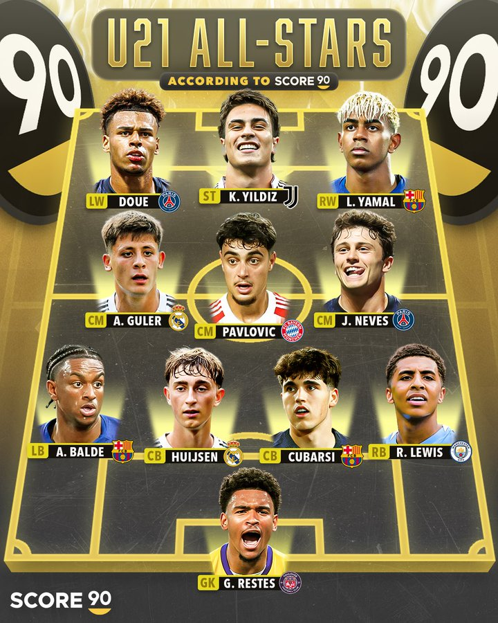 Издание Score 90 создало сборную лучших футболистов, которым еще не исполнился 21 год. Практически каждый из них уже зарекомендовал себя на высшем уровне и считается постоянным игроком старта топ-клуба. Вратарь Гийом Рест из «Тулузу» − игрок основы французского клуба. Ему всего 20 и он явно в скором времени пойдет на повышение. Защитник Алекс Бальде зацементировал левый фланг «Барселоны», а Пау Кубарси − центр. Дин Хейсен за огромные деньги перебрался из «Борнмута» в «Мадрид» и готов стать игроком основы «сливочных». Рико Льюис внезапно стал главным выбором Пепа Гвардиолы на правом фланге. На второй сезон в «Мадриде» Арда Гюлер стал получать больше игрового времени, Александар Павлович хорош в «Баварии», а Жоау Невеш перешел в «ПСЖ» и помог команде выиграть Лигу чемпионов. Дезире Дуэ стал настоящим откровением в «ПСЖ», а Ламин Ямаль еще до 18-летия стал главным вундеркиндом планеты. Кенану Йылдызу из «Юве» привычнее слева, но опыт в центре у него тоже есть. А кого вам не хватает в этой