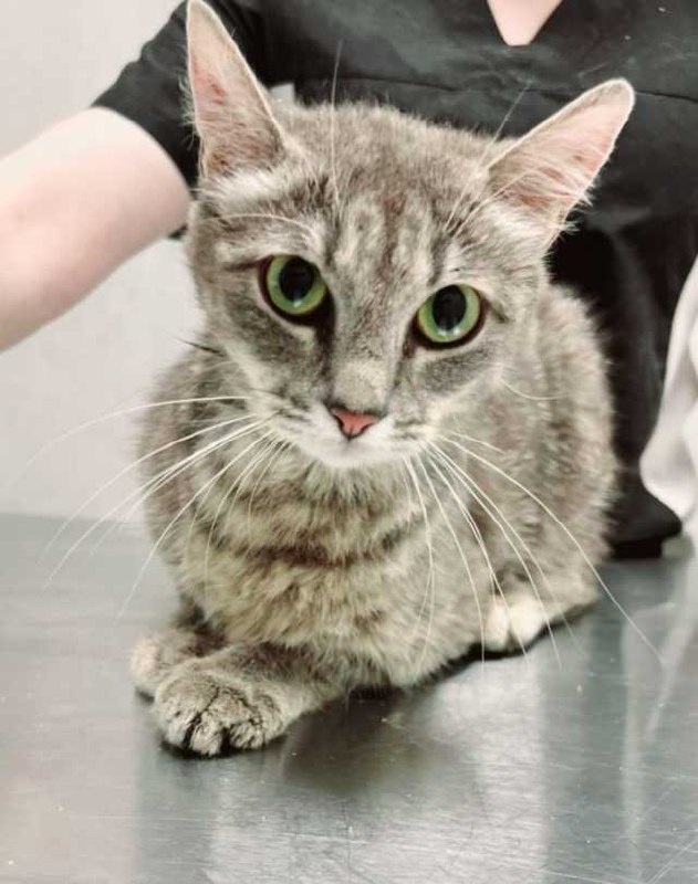 Серебристую красотку с жёлто-зелёными грустными глазами выкинули на территорию психушки, выживала в разрушенной хибаре и в холод, и в жару. Рожала каждые 3 месяца, котята погибали.