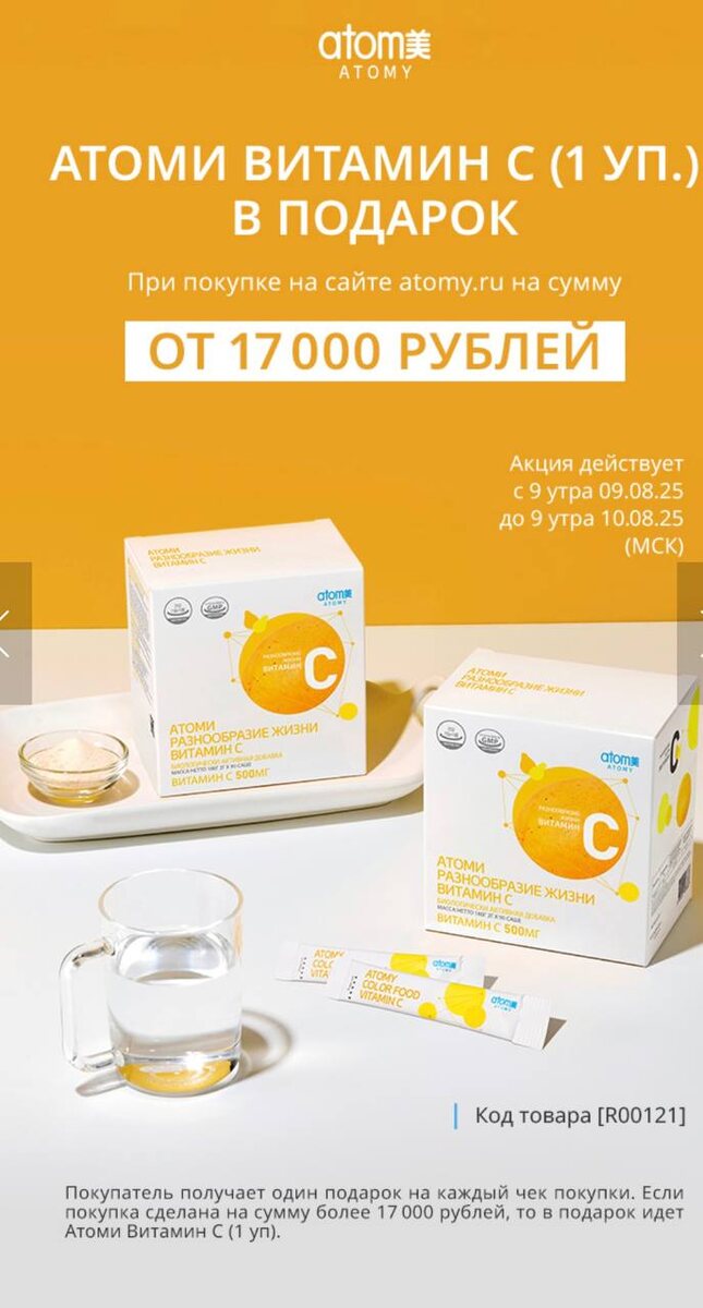 Дорогие участницы, с завтрашнего дня стартует акция прекрасная у Атоми . Витамин С идет в подарок 🎁 Он является основой в решении аутоиммунных заболеваний, и также он стимулирует коллаген и эластин, делая кожу сияющей и упругой. В Атоми прекрасная форма Витамина С - не раздражающая стенки желудка и легкоусвояемая.