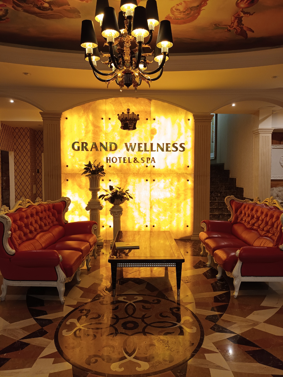В ресторан Grand Wellness мы пришли около восьми вечера, все столики были свободны, кроме двух, но вскоре ушли и эти посетители, так что мы с дочкой остались одни. Это нас совсем не напрягало, играла тихая приятная музыка, официантка была любезна и внимательна, но без навязчивости, еда была довольно вкусная, так что мы провели очень приятный вечер.