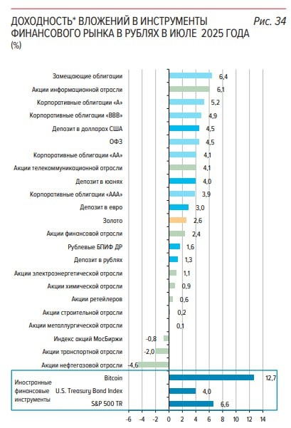 ЦБ назвал самый доходный актив за 12 месяцев и это уже не золото ЦБ назвал самый доходный актив за 12 месяцев и это уже не золото За последние 12 месяцев ОФЗ обогнали золото и корпоративные облигации с рейтингом «А», став наиболее доходным активом среди российских инструментов, сообщается в «Обзоре рисков финансовых рынков». ОФЗ за последний год показали доходность 27,4%, в то время как корпоративные облигации «А» 26,5%, золото 24,6%. Драгметалл продолжительное время был самым доходным активом на горизонте 12 месяцев. С начала 2025 года наибольшая доходность осталась у корпоративных облигаций (от 16,5 до 27%) и ОФЗ (18,7%). Худший результат на российском рынке вновь показали инструменты, привязанные к иностранной валюте: депозиты в иностранной валюте (от 9,8 до 18,1%) и замещающие облигации (11,7%). Однако в июле замещающие облигации стали наиболее доходным активом (6,4%), как пояснил регулятор на фоне снижения ставок и ослабления рубля. По итогам июля следом идут такие активы*: