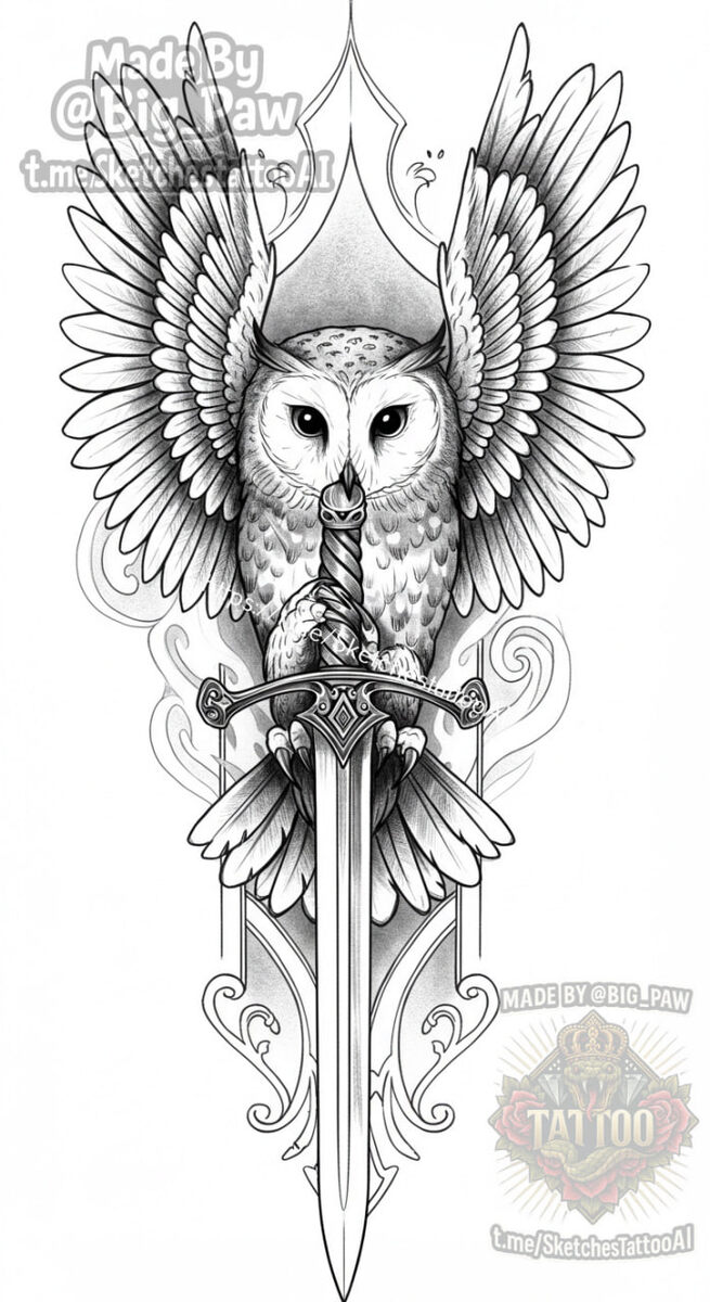 #2658 Подборка по запросу подписчика - Сова с расправленными крыльями, держит меч в лапах,меч направлен в низ 🧠 SYNTX 💳 Донат 😎 НейроБро 😎 Эскизы без вотера 💀 Эскизы от нейросети #сова #меч #птицы #эскиз #тату #татуировка